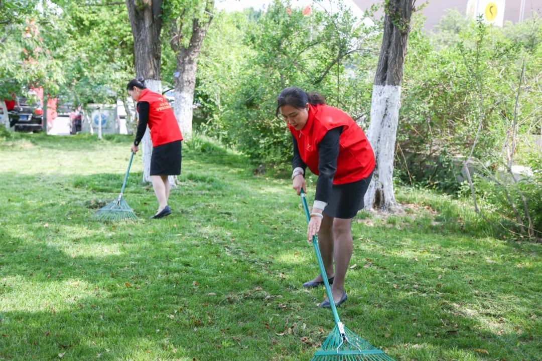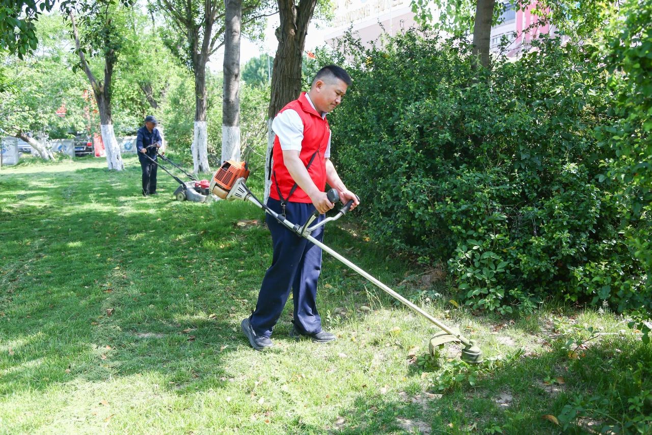 针对假日客流量大,院内卫生清理压力提升,团员青年及时响应大厦团委号召,主动承担责任,借鉴城市管理领域的“模块化保洁”经验,推出“人机协同+分区攻坚”模式。团员青年与机械割草机同步作业,对院内道路、绿化带进行清理美化。