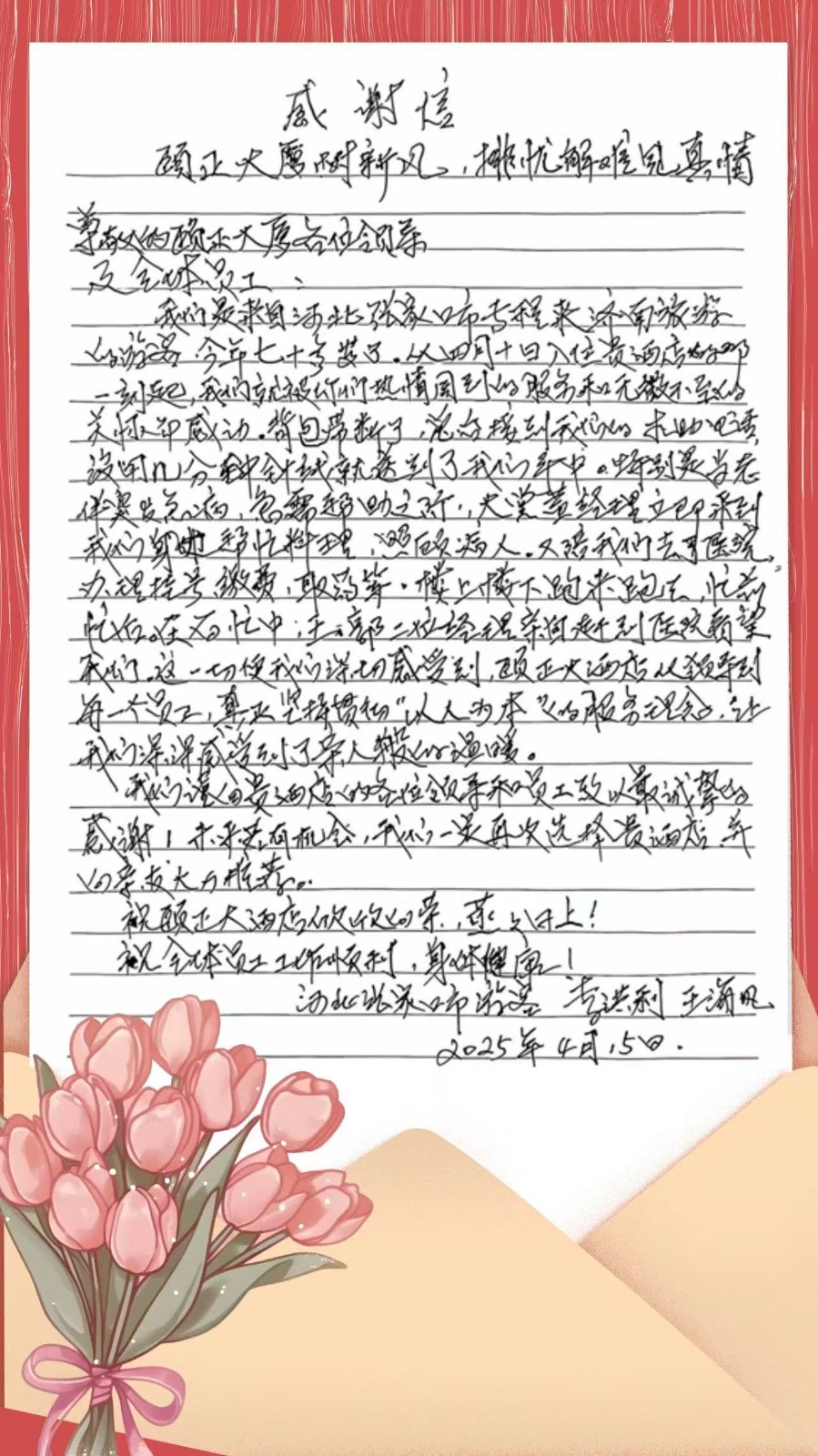 排忧解难守护长者旅居平安。权属酒店山东颐正大厦创新构建“安全预判-流程预演-温情预置”服务体系,通过110余项安全设施排查、月度应急演练,实现风险前置管理。4月14日成功处置的七旬老人突发疾病事件,展现了“黄金救援”的国企担当。从启动应急预案到急诊科对接,仅用20分钟完成全流程护送,员工全程陪护挂号缴费取药,用热情周到的服务和无微不至的关怀赢得“生命救援锦旗”。老人在感谢信中写道,“颐正大厦从领导到每一位员工,真正坚持以人为本的服务理念,让我们深深感受到了亲人般的温暖”。