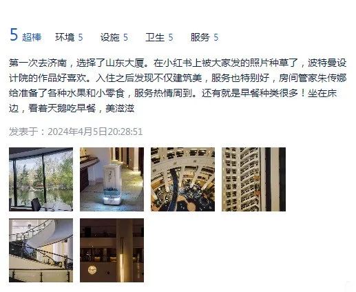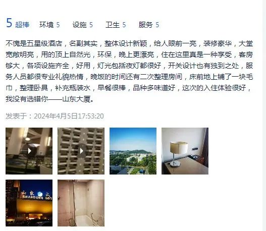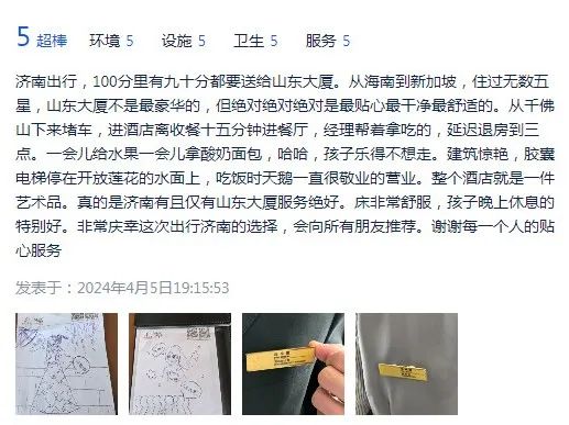 山东大厦秉承“阳光微笑暖人 love服务暖心”的服务理念,用「有温度的服务」为每一位客人营造温馨舒适愉悦的食宿体验,收获了线上线下各渠道的好评反馈,携程网综合得分4.9分,以优质的服务收获一路“繁花”。