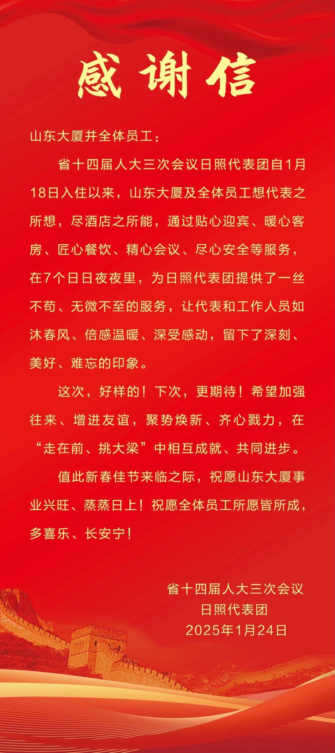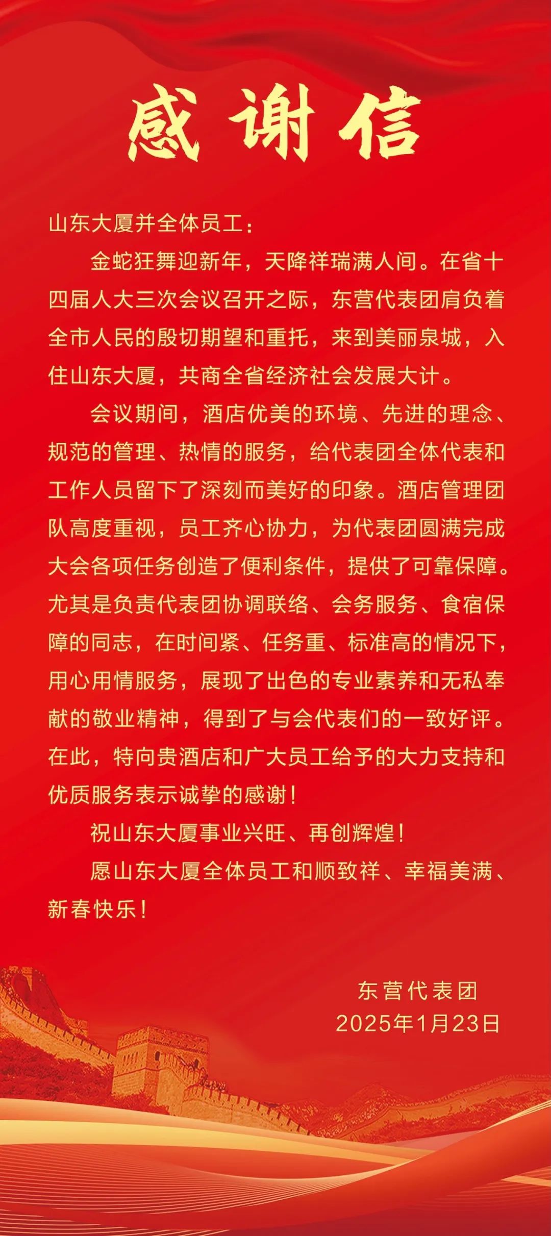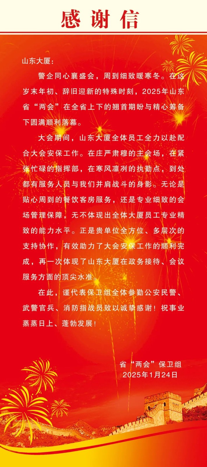 会议保障任务圆满完成,山东大厦再一次交出了令人满意的答卷,再一次展现了大厦人真诚好客的热忱和专业过硬的品质。一封封载满温暖的感谢信和锦旗纷至沓来,这既是对全体干部员工辛勤工作的褒奖,更是对大厦人奋楫笃行、再启新程的鞭策。