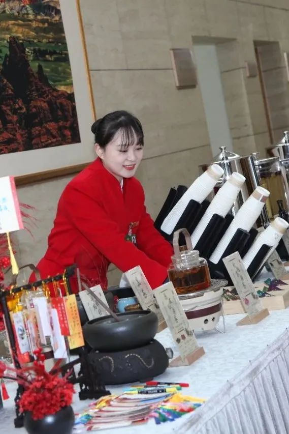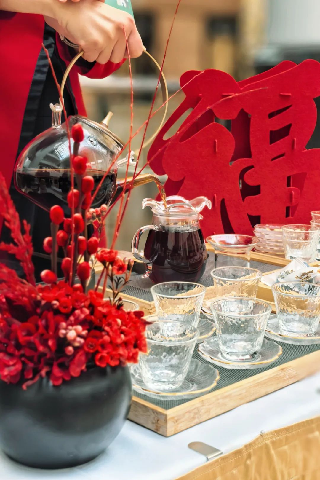 会议中心还创新设计了“心意满满,新春焕彩”主题茶水台,在传统茶饮基础上增加了苹果热橙茶、肉桂苹果茶等种类,摆放了茶文化古诗书签、手写心愿卡,令与会人员在中场休息时既能够润嗓提神,又能品味茶水台的文化气韵。