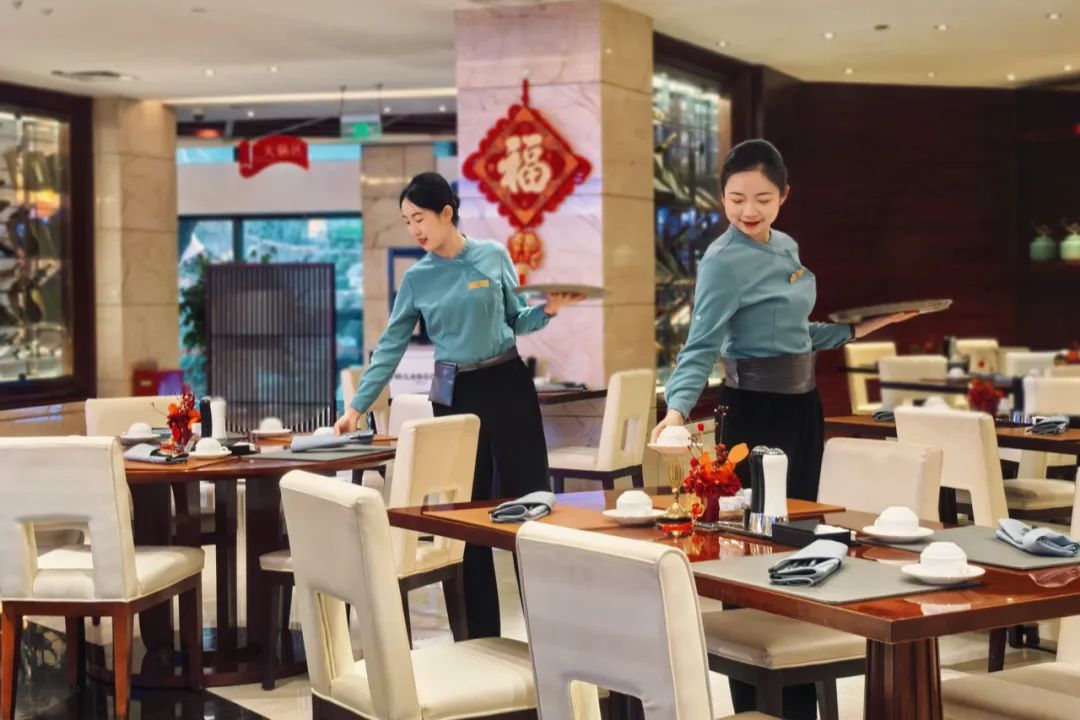 “斟水秀”是会议中心会议接待中的独特环节,看似简单的倒茶水流程,被细化分解为20多个步骤。从行到止,从调到斟,再到水温、水量,每一个环节都严谨有序,为服务增添了艺术的美感。