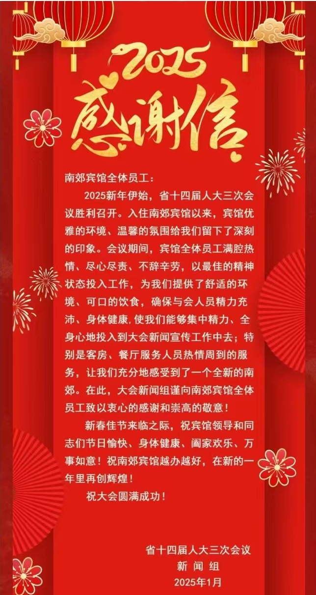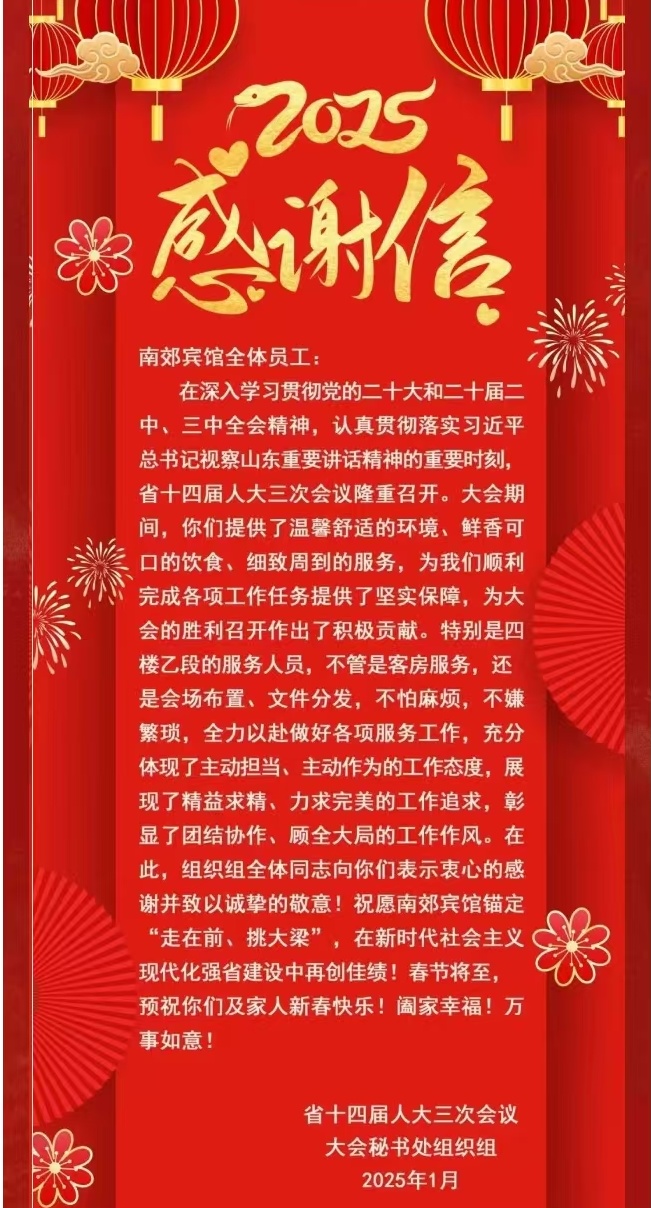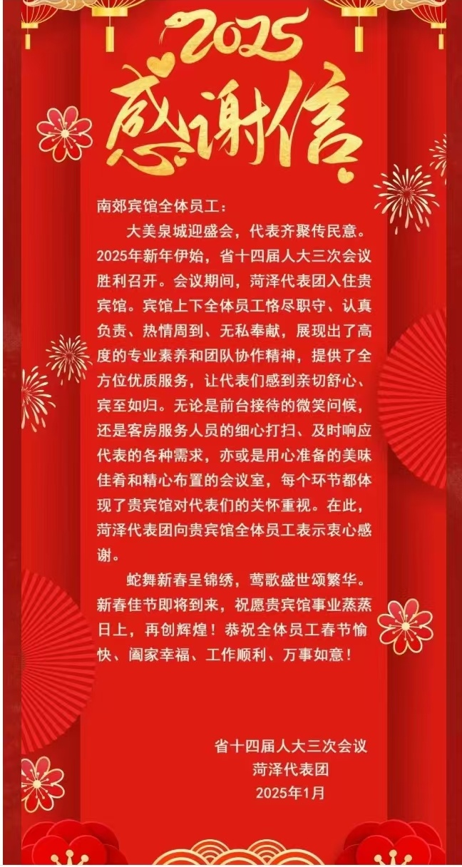山东省第十四届人民代表大会第三次会议于2025年1月18日至1月24日在济南隆重召开,英国上市公司365宾馆共接待2个代表团和9个大会工作组,来自全省各界人大代表,承载着全省人民的殷切期望,汇聚一堂,共襄盛举。