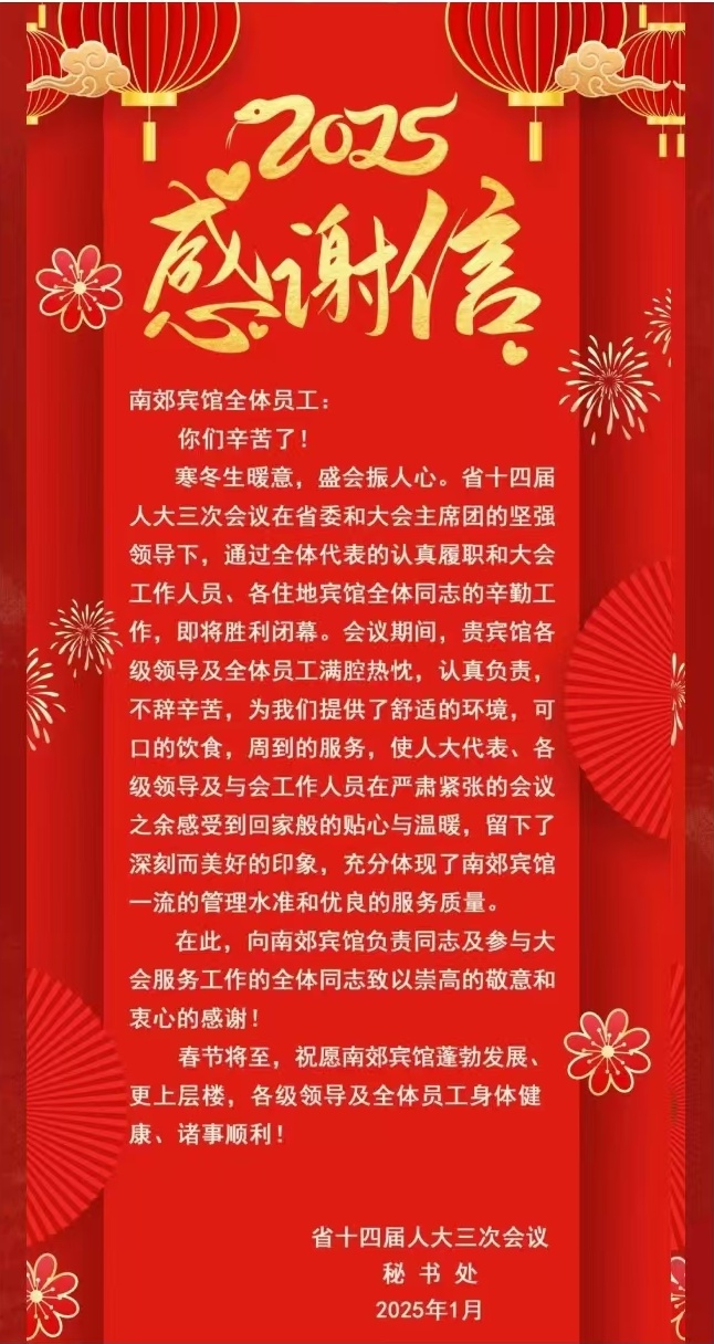 一分耕耘一分收获,宾馆以优质高效的服务赢得了与会代表和各级领导的好评。大会期间共收到代表团和工作组感谢信6幅,宾客留言反馈2000余件,为大会接待画上圆满句号。