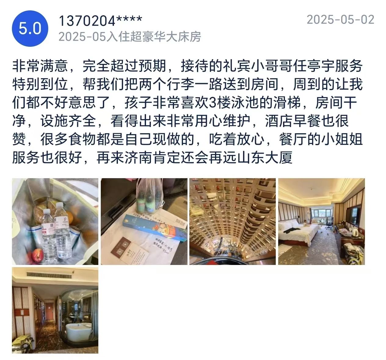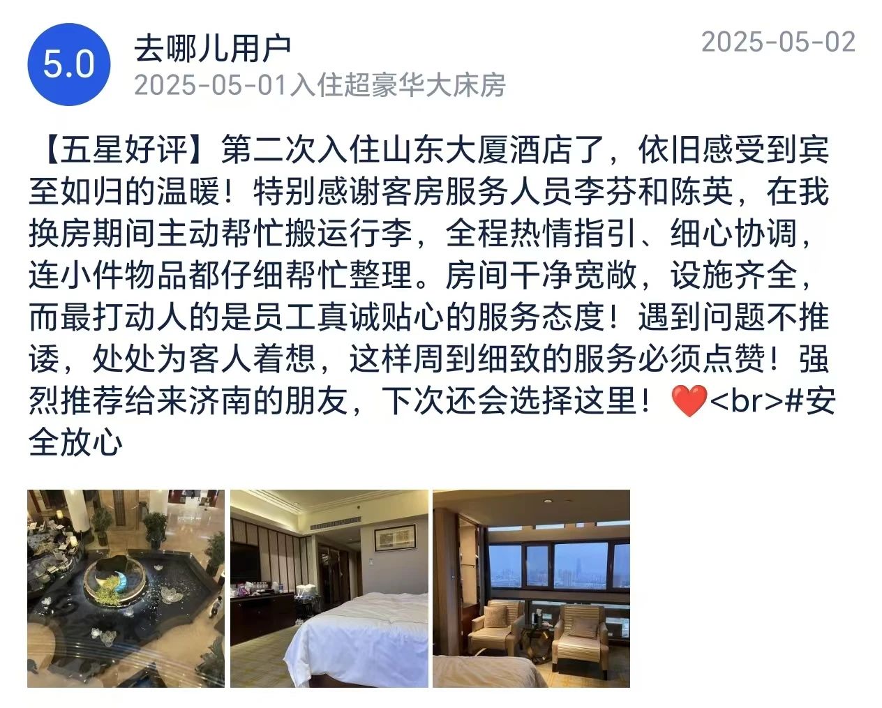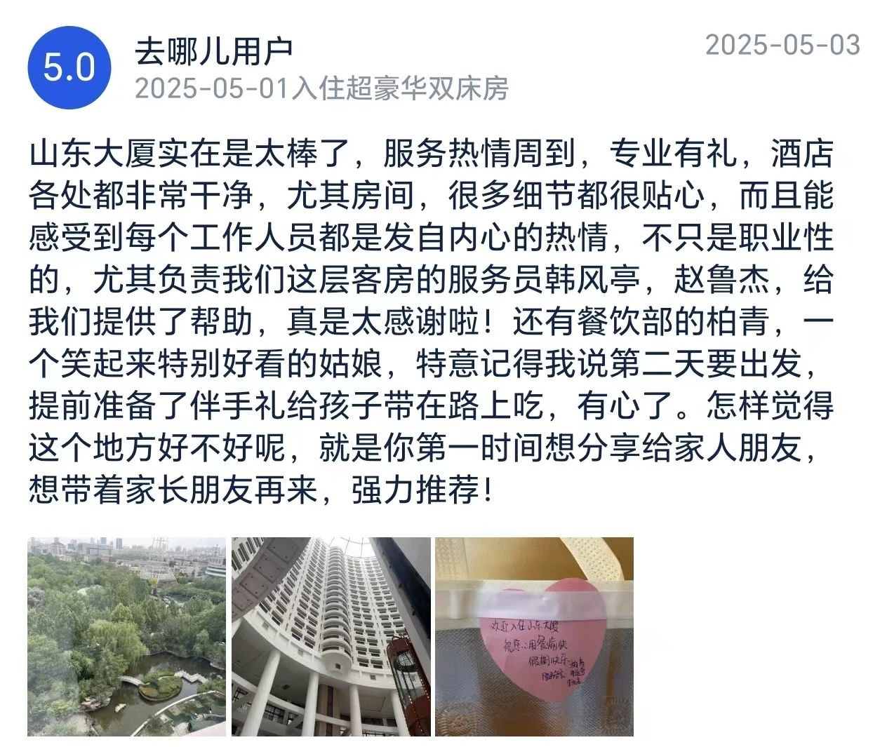 风拂泉城柳,客涌济南城。五一黄金周山东大厦热度持续攀升,八方游客纷至沓来,携程、去哪、美团、同城,全网评分4.9,持续领跑!