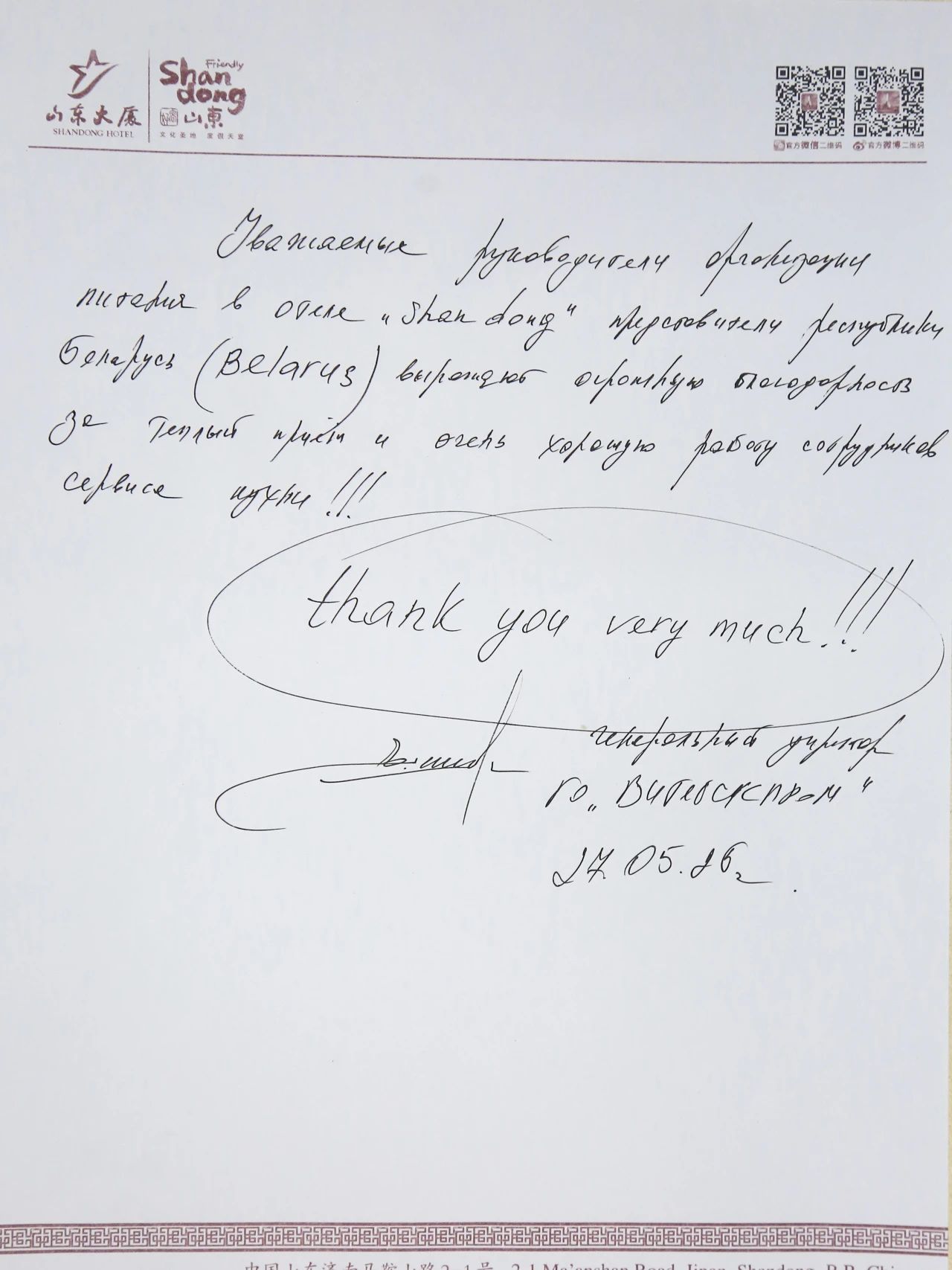为山东大厦写下感谢信