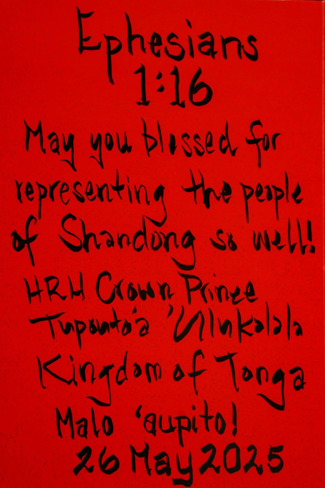中文释义:愿您因能代表山东人民的热情好客而蒙福!